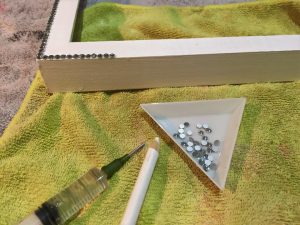 After we painted the felt, we moved onto painting the frame white – (we used the white pot from the chalk paints) and set that aside to dry.